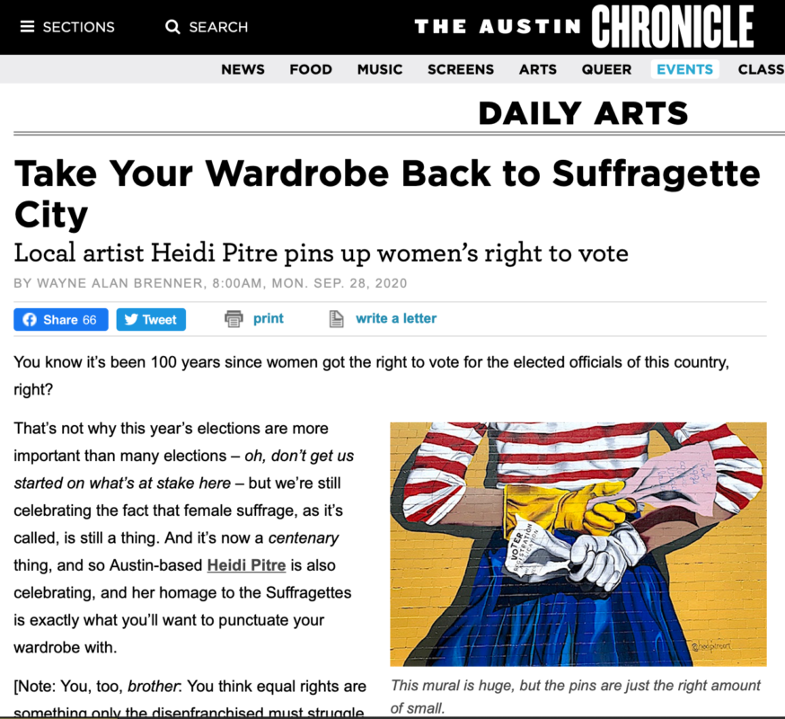 Her 40-foot mural, “Suffragette” in Hattiesburg, Mississippi, celebrates the 19th amendment and is dedicated to all women who have held office over the last century. Heidi currently resides in Kansas City, constantly adding to her CV, which you can view here.