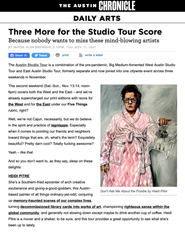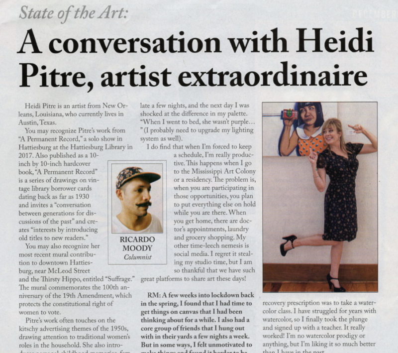 By 2009 she was a full-time artist with the help of commissions, public art, and digital projects. She is a recipient of the Pollock Krasner Grant as well as the Mississippi Arts Commission Fellowship, with an ever-expanding list of publications, residencies, grants, awards, and nationwide shows. In 2019 she had simultaneous solo shows for the West Austin Studio Tour. One show was a series of paintings titled Southern Peculiar at the Dougherty Arts Center in addition to her collection of exquisitely rendered library card drawings in detail at the Elizabet Ney Museum. Both collections have been displayed multiple times across the country.