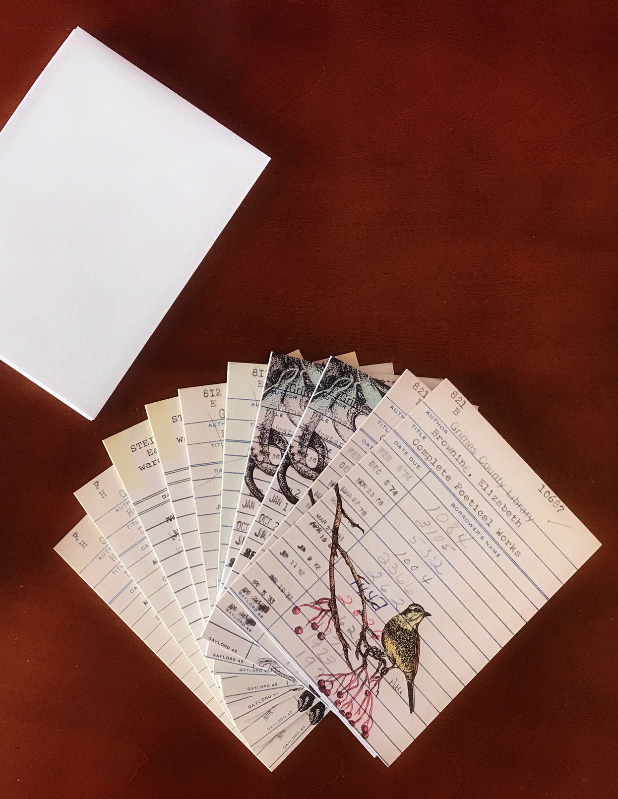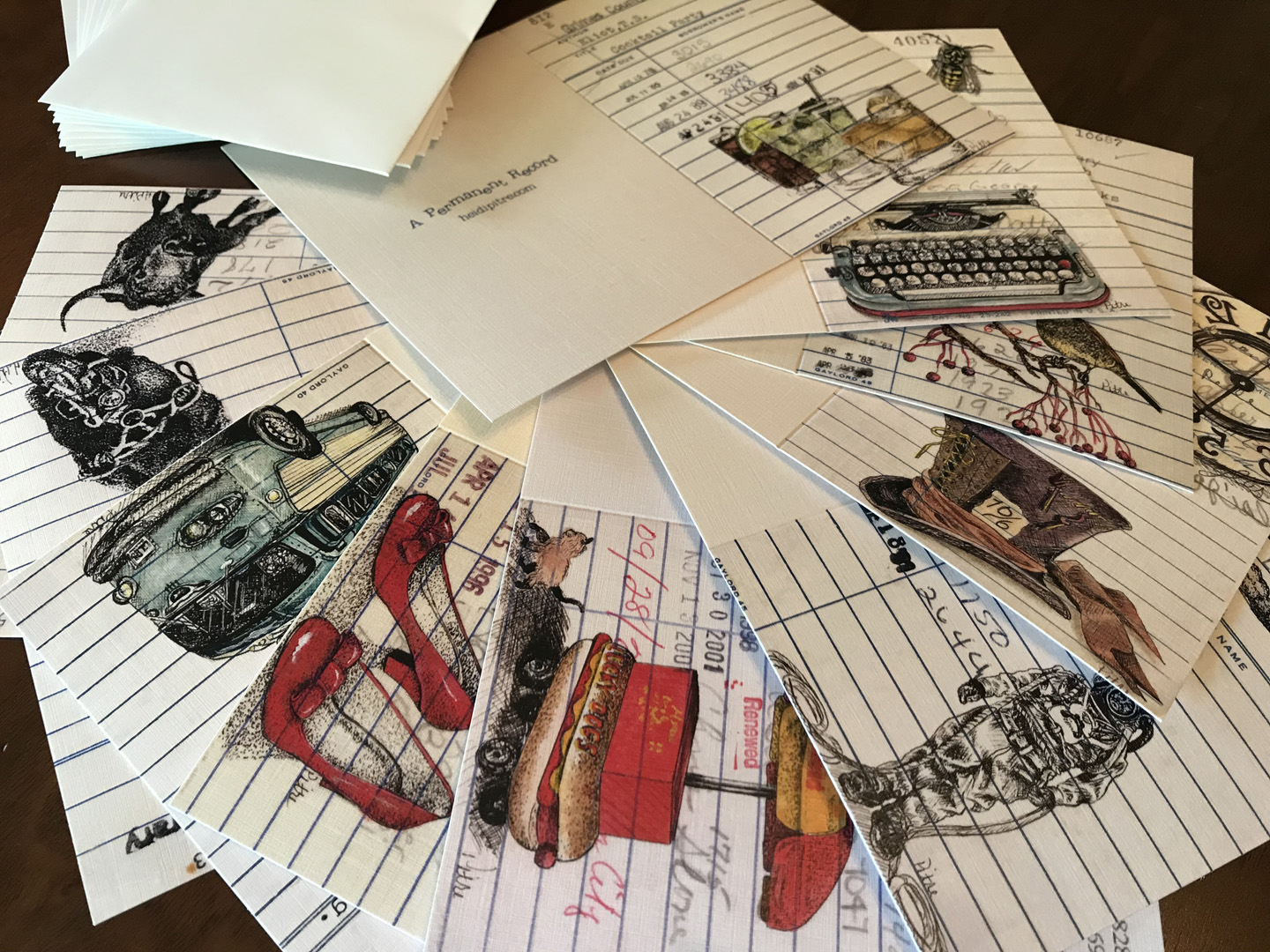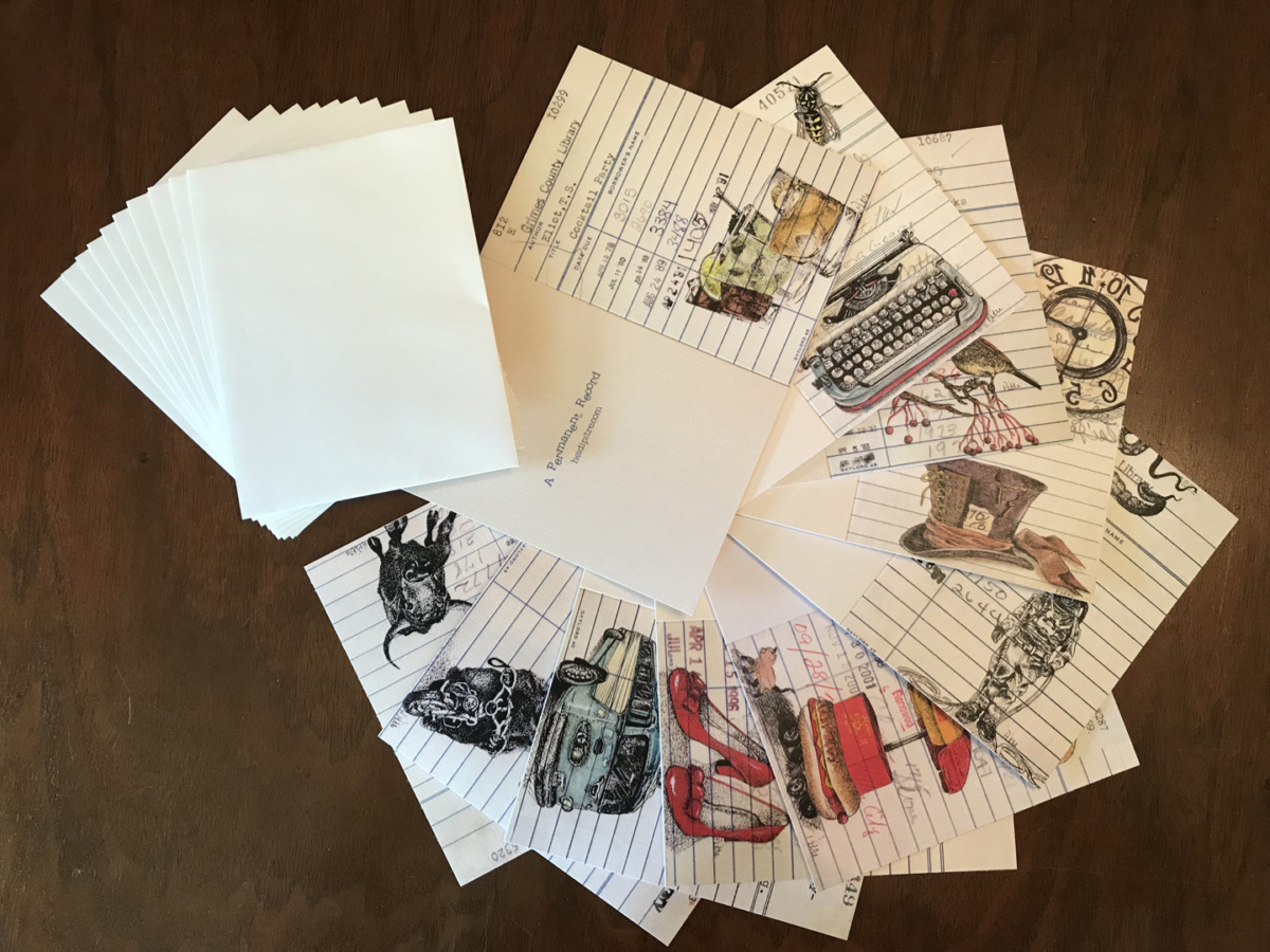 Set of 10 – 4 x 5.5″ of Heidi Pitre’s library card drawings on linen notecards.