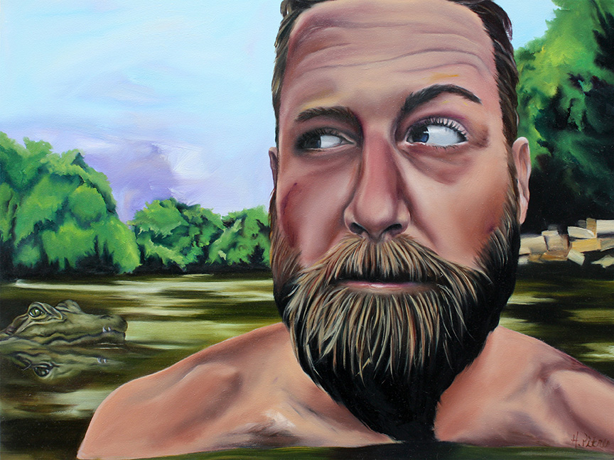 My work examines the South and its people in all their peculiar wonder. Shining a light on the parts that make us smile, and a flashlight into the dark parts that don’t. The paintings reflect the “Sunday afternoon” South: colorfully painted, depicting heartwarming scenes, with a twist that is all too familiar, even odd or absurd, but light-hearted and funny, even if you’re not exactly sure why. That’s the side of the South that we want you to see. Other works examine a deeper, more “raw” version of the South, the side we don’t show to just anybody. These works, focusing on the South with its flaws exposed, represent a recognition of its blisters and scars. Through the use of stark black on white, these rich, realistic charcoal drawings strip away any distractions from the possibly distasteful theme.